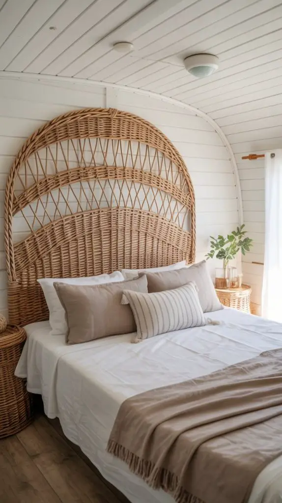 Add natural texture to your bed with a headboard made from woven wicker or rattan. The headboard is a large, rectangular panel with a classic basket weave pattern, its natural cane color adding warmth against a soft white wall. This material is lightweight and airy, preventing the bed from feeling too heavy or imposing in the small space.