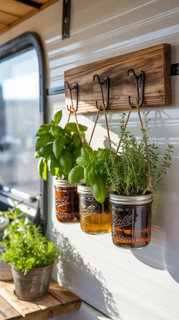 Create a functional and cute kitchen garden with hanging Mason jars. A reclaimed wooden board is mounted on the wall, from which simple metal holders suspend several glass Mason jars. Each jar is filled with soil and a small, growing herb like basil, mint, or thyme, with their fresh green leaves spilling over the top.