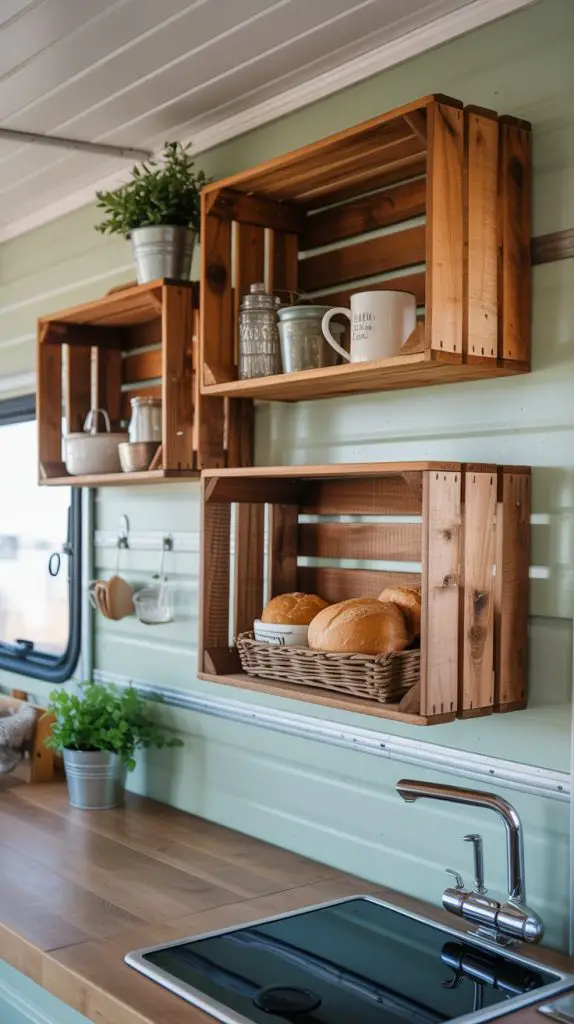 This idea brings an authentic, farmhouse feel to your camper. The open shelving makes small items easy to find and access, while the natural wood grain adds warmth and contrasts beautifully with the soft white and pastel colors typical of shabby chic.