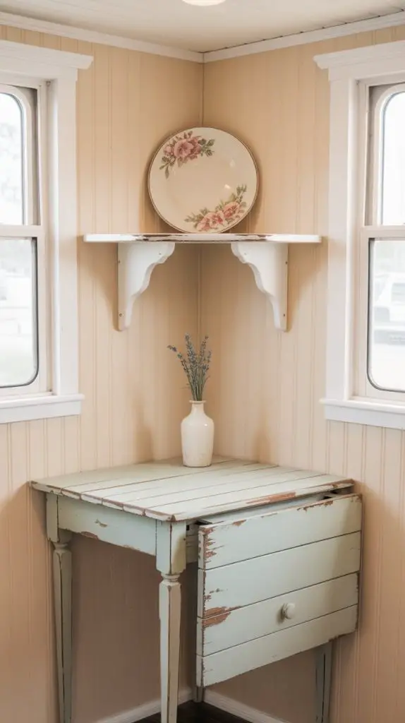 Nestled in the corner of the camper’s kitchen, this nook features a small, drop-leaf table with a heavily distressed white paint finish, showing hints of a pale blue undertone. The walls are clad in beadboard, painted in a soft, buttery cream. A tiny, open shelf above the table displays a single vintage floral plate and a small milk glass vase holding a sprig of lavender, proving that even the smallest details contribute to the overall charm.