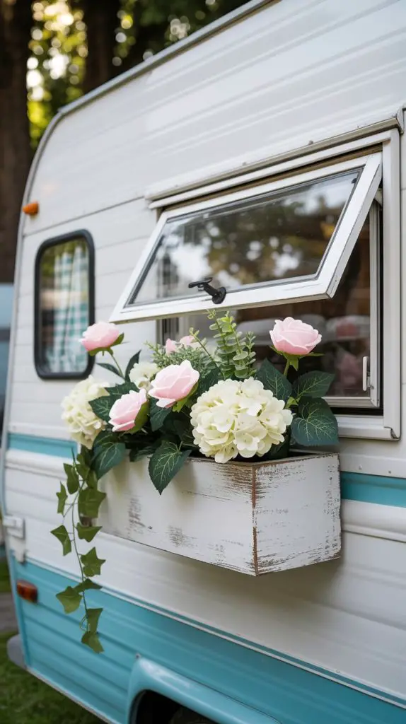 PRO TIP: Use UV-resistant artificial flowers to prevent them from fading quickly in the sun. Secure the window box firmly to the camper’s exterior frame, and use floral foam inside the box to anchor the stems so they don’t blow away while driving.