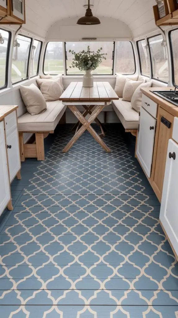 Elevate your camper’s foundation with a painted and stenciled floor. The base is a soft gray or beige paint, durable enough for high traffic. Over this, a delicate, all-over stencil pattern is applied in a slightly off-white color, mimicking the look of an expensive encaustic tile or a vintage rug with motifs like quatrefoils or small flowers.