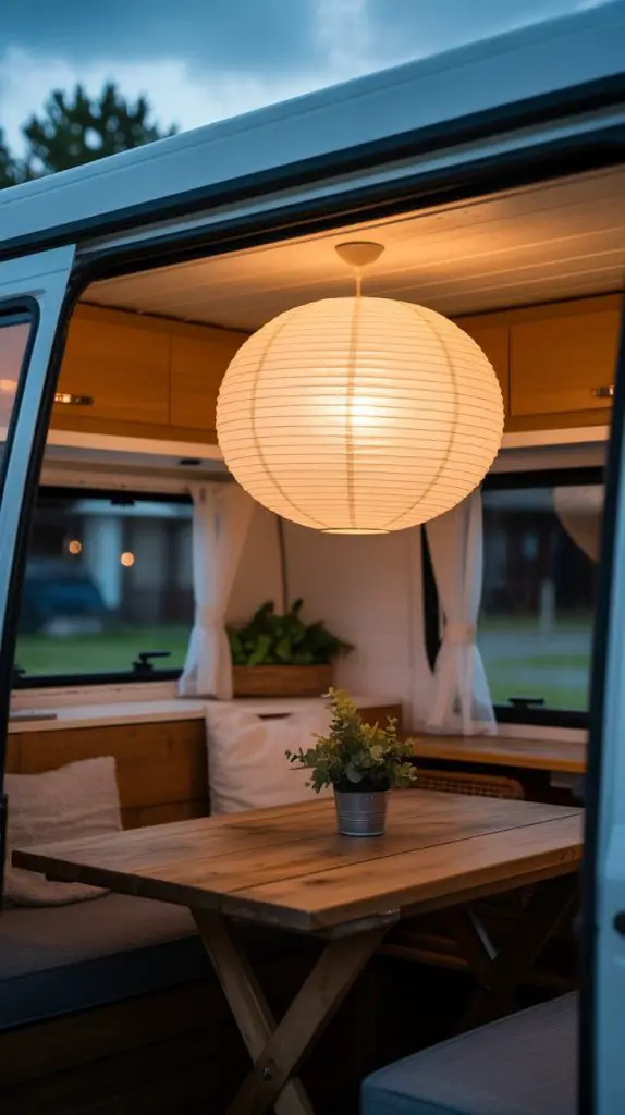 Replace a standard, harsh RV light fixture with a large, white paper lantern. The lantern is spherical and simple, diffusing the light from a bulb into a soft, warm, and gentle glow that fills the room. It hangs from the ceiling over the dinette or living area, immediately modernizing the space with a touch of minimalist, organic texture.