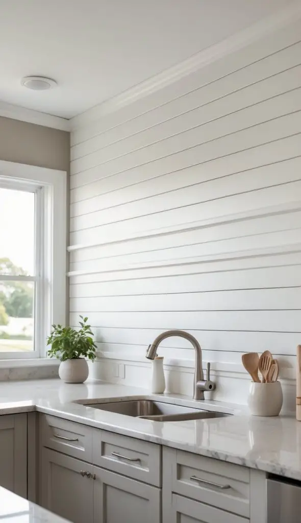 This type of shiplap is easy to clean, making it practical for kitchen walls. You can paint it in soft colors like white or pastel shades to keep your space bright and cozy. It also protects your walls from splashes and spills.