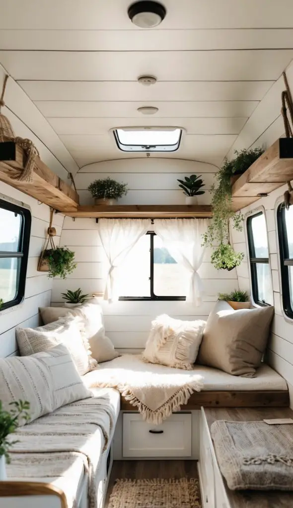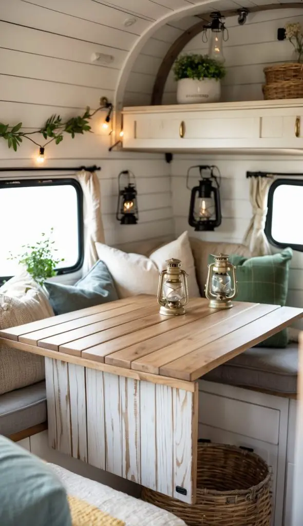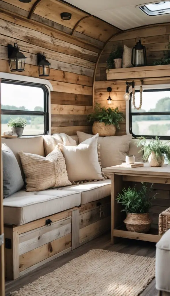 Adding shiplap panels to your camper’s ceiling can make the space feel warmer and more inviting. The wood texture creates a soft, rustic look that fits perfectly with shabby chic style.
