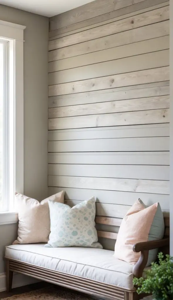 Shiplap adds texture too. The horizontal lines create a cozy, vintage look. It fits perfectly with the shabby chic style you want.
