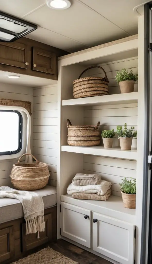 The texture of shiplap adds charm and depth. It makes your cubbies feel like a special part of your camper’s style.