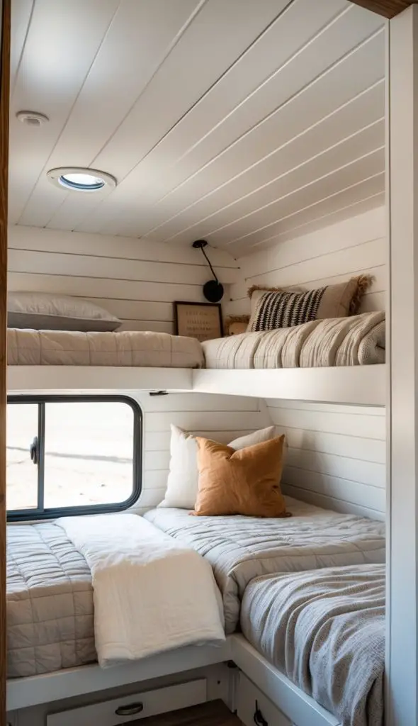 Adding shiplap above your camper bunks gives the space a cozy, finished look. It breaks up plain walls and adds texture without taking up space.