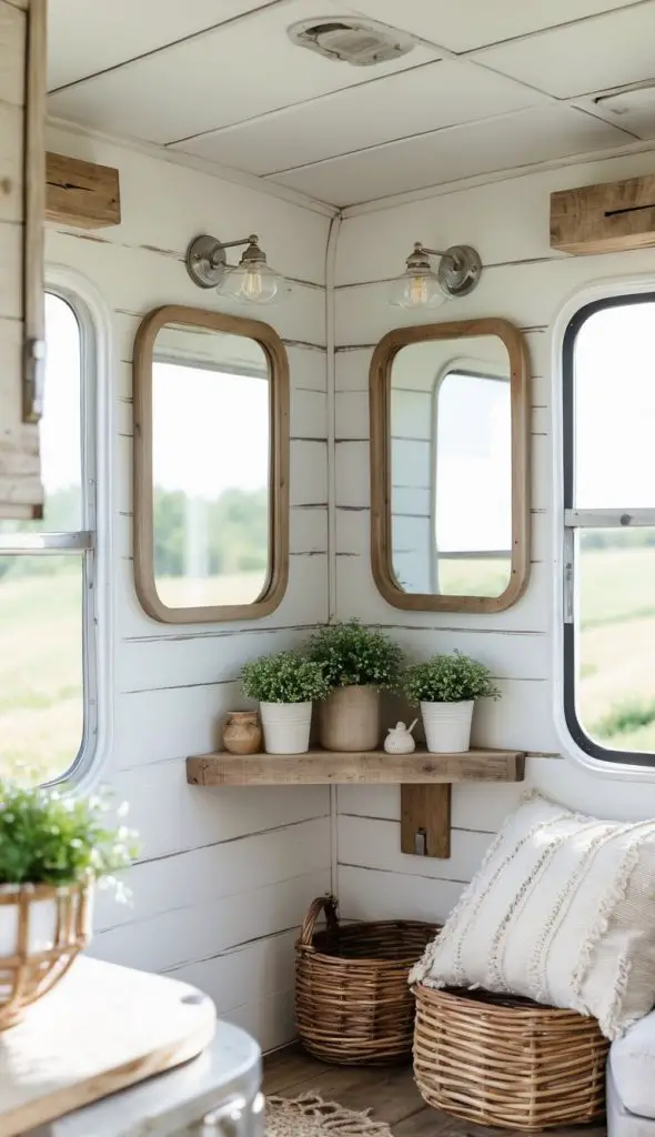 Adding shiplap around your mirrors can give your camper a cozy farmhouse feel. It works well as a frame and adds texture to plain walls.