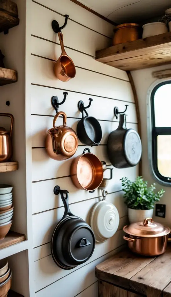 Pick hooks with a rustic or worn finish to match the shabby chic vibe. This small detail makes your kitchenware blend perfectly with your camper’s style.