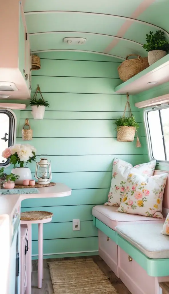 Choosing pastel tones like mint or blush pink can brighten up your camper in a soft, gentle way. These colors add a fresh look without being too bold or overpowering.