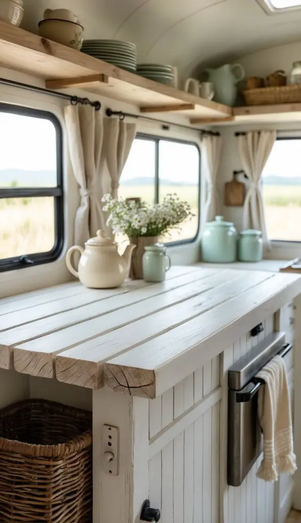 Adding shiplap shelves in your camper helps keep things tidy and adds charm. You can use them to hold small plants, books, or your favorite travel souvenirs. Shelves made from shiplap match the shabby chic look perfectly.