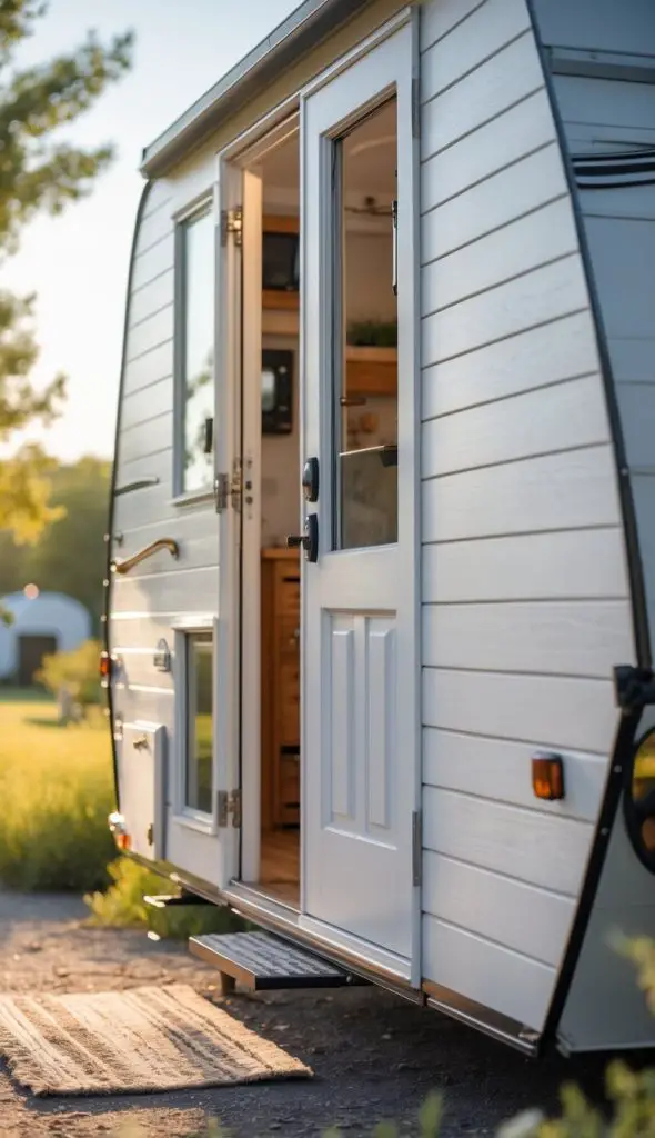 Adding shiplap around your camper’s entrance door gives it a warm and inviting look. It frames the door nicely and adds texture that fits the shabby chic style. You can paint the shiplap in soft pastels or white to keep the look light and fresh.
