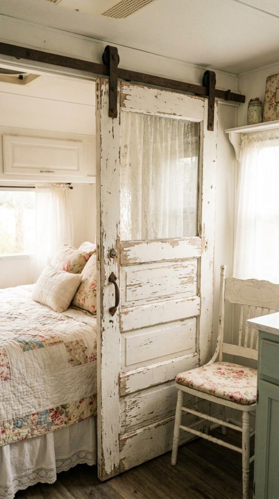 Replace traditional swinging doors with a sliding barn door to separate spaces in your camper without sacrificing precious floor space. A distressed white wood door with vintage hardware and lace curtain accents creates a charming partition between your bedroom and living areas while embodying rustic cottage elegance. Sliding doors eliminate the clearance needed for traditional doors to swing open, immediately making your camper feel more spacious.