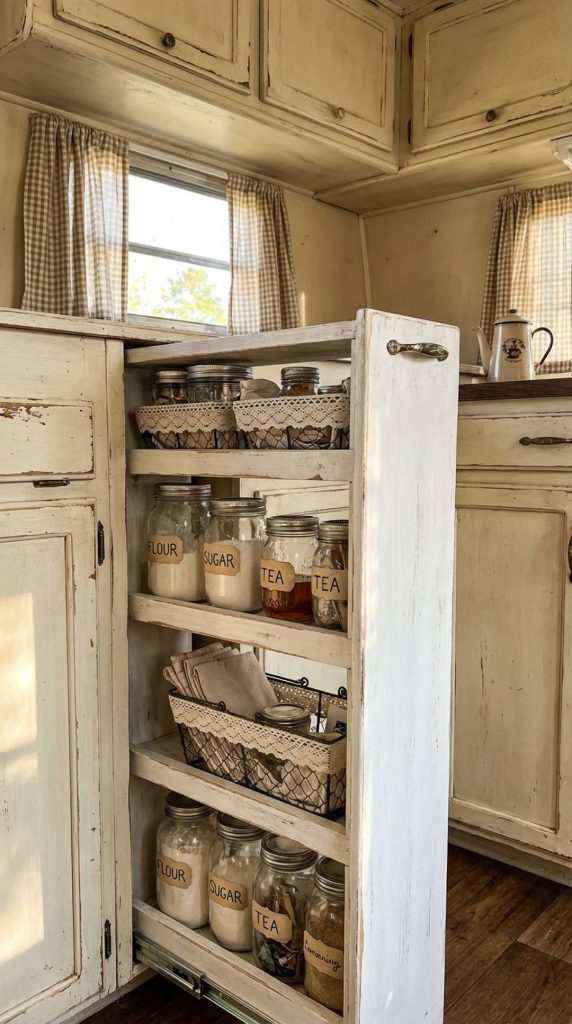 A narrow pull-out pantry cabinet on wheels maximizes the use of slim spaces between appliances or in awkward corners of your camper kitchen. Choose a unit with distressed white wood, vintage labels, and wire baskets lined with lace to store dry goods, canned items, and kitchen essentials. This rolling solution slides into tight spaces when not needed and pulls out smoothly when you’re preparing meals.