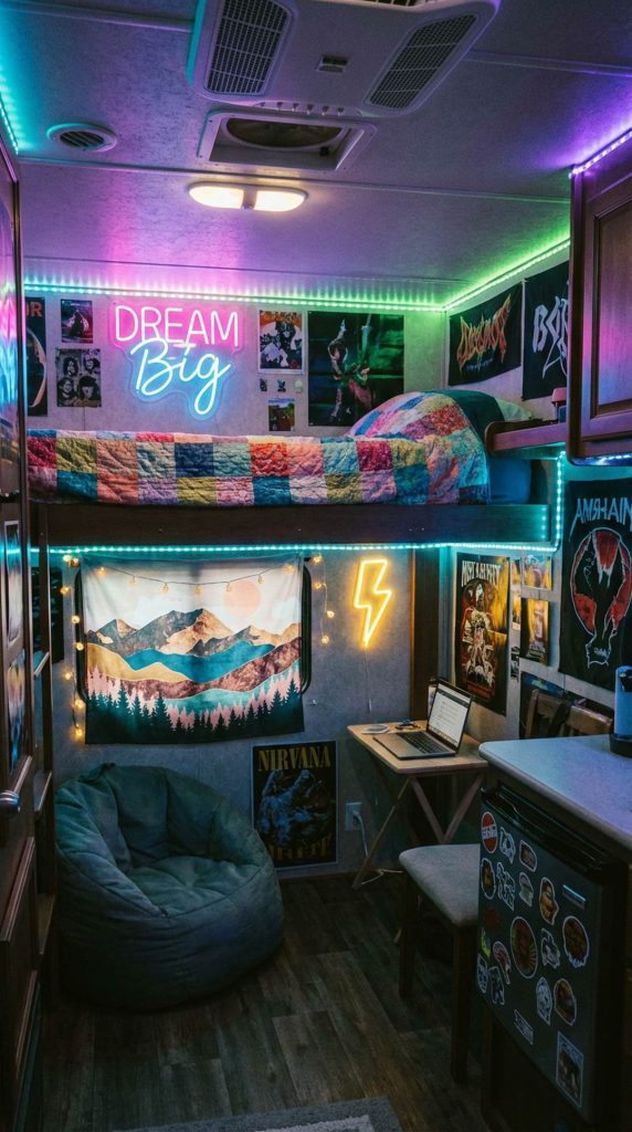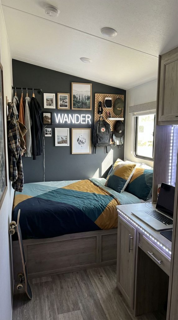 Use removable wallpaper or peel-and-stick panels if painting isn’t an option in your RV, or if you want the flexibility to change the look later. Darker colors can make a small space feel cozier and more intimate, which many teens appreciate. Coordinate bedding, throw pillows, and accessories with the accent wall color for a cohesive, designer look.