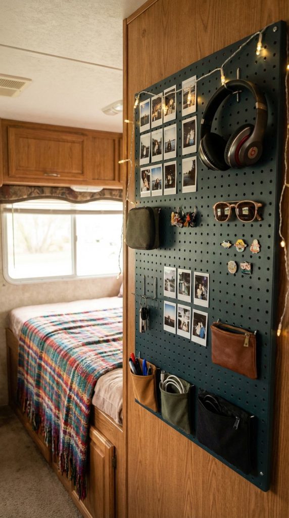 A wall-mounted jewelry organizer keeps necklaces untangled, earrings paired, and bracelets visible and accessible. These organizers come in various styles from decorative displays that showcase jewelry as art to functional systems with hooks, bars, and compartments. Vertical storage is key in an RV, and jewelry organizers make excellent use of otherwise empty wall space.