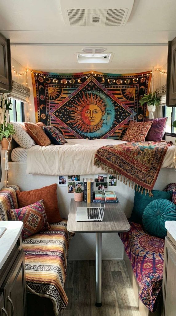 Tapestries provide an affordable, impactful way to add color, texture, and personality to RV walls. These large fabric hangings come in endless designs from bohemian and nature-inspired to geometric and abstract patterns. Tapestries can cover entire walls, define sleeping areas, or even serve as bedside backdrops, instantly transforming the look and feel of a space.